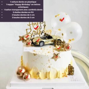 Le set inclut une voiture dorée en plastique rigide à placer au sommet du gâteau, accompagnée d’un topper « Happy Birthday » au style artistique raffiné. Pour compléter la mise en scène, trois ballons transparents garnis de confettis dorés viennent donner de la légèreté à l’ensemble.